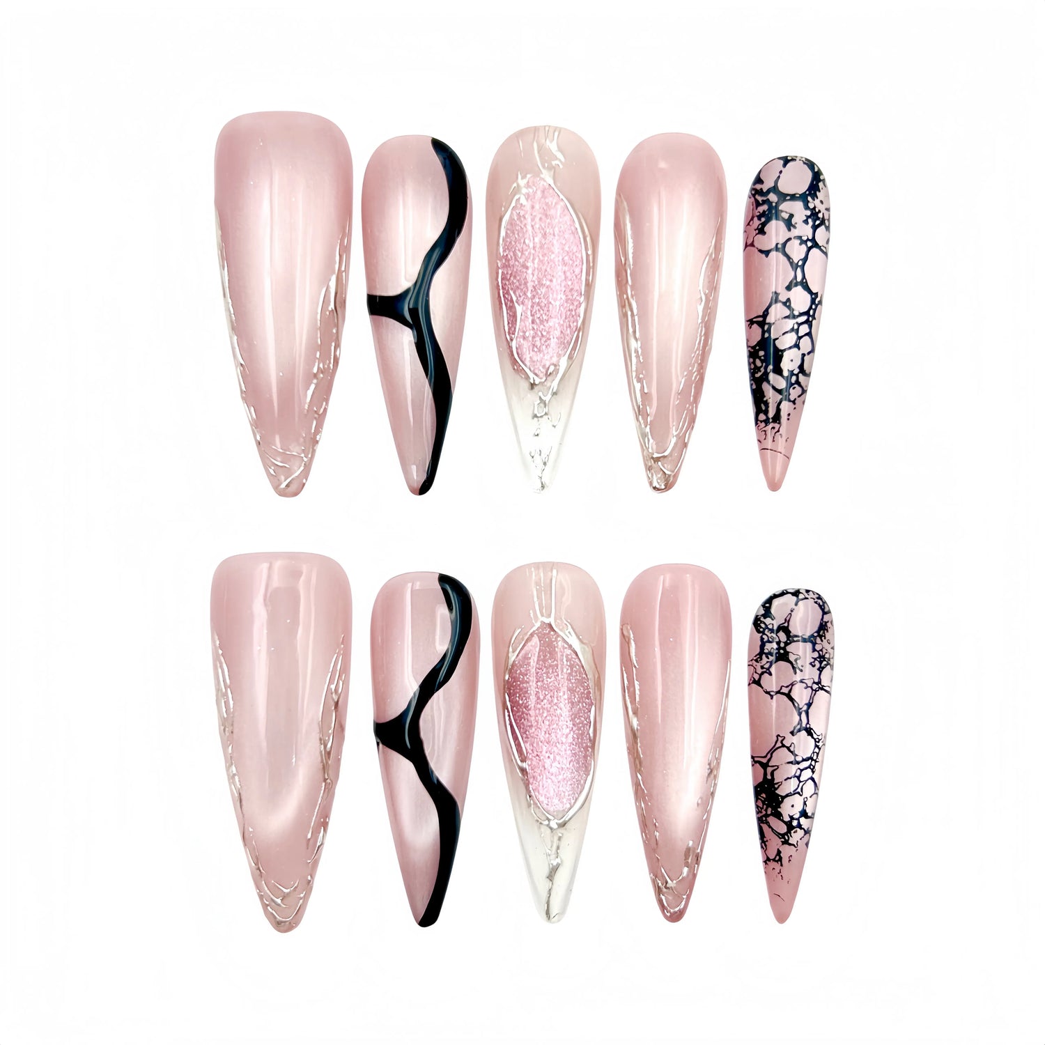 Pink Black Marble Press-On Nails - Glitter Art False Nails UK